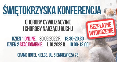 Bezpłatna hybrydowa konferencja IAMP z cyklu chorób cywilizacyjnych i chorób narządu ruchu. Piątek - online. Sobota stacjonarnie w Hotel GRAND przy ul. Sienkiewicza 78 w Kielcach. Krótkie, praktyczne wykłady. Materiały i punkty edukacyjne.